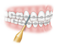 Ablagerungen an den Drähten lassen sich gut mit Interdentalbürstchen entfernen. Dazu wird das Bürstchen unter den Draht geschoben und mehrfach von oben nach unten gezogen.
